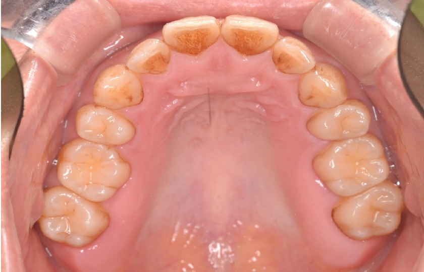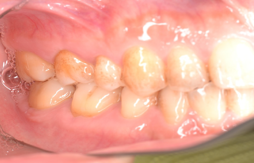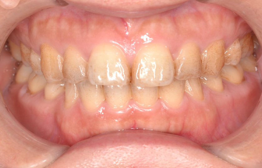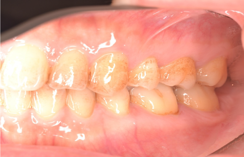 治療内容 染出し液でバイオフィルムを可視化し、エアフローにてバイオフィルム、ステイン、早期歯石を除去。残った歯石をピエゾンチップPSにて除去し、歯面パックをした。